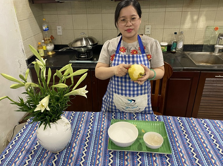 - Trong thời gian chờ ngâm yến thì chúng ta sẽ gọt trái lê. Lưu ý khi chọn lê tránh những quả bị dập nát để ko bị mắc bệnh đường ruột. Trái lê gọt vỏ, khoét giữa (dùng dao có đầu nhọn rồi thìa để khoét) để cho yến sào vào giữa trái lê. Khi gọt vỏ ta cho trái lê đã gọt vào bát nước có pha chút giấm để lê không bị thâm.