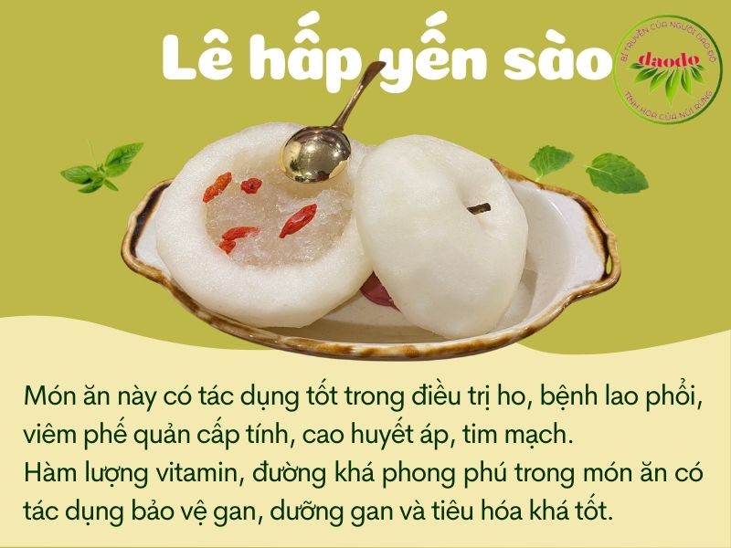Lê hấp yến sào là một món ăn rất ngon, mát và bổ dưỡng. Ăn món này thường xuyên có tác dụng tốt trong điều trị ho, bệnh lao phổi, viêm phế quản cấp tính, cao huyết áp, tim mạch.