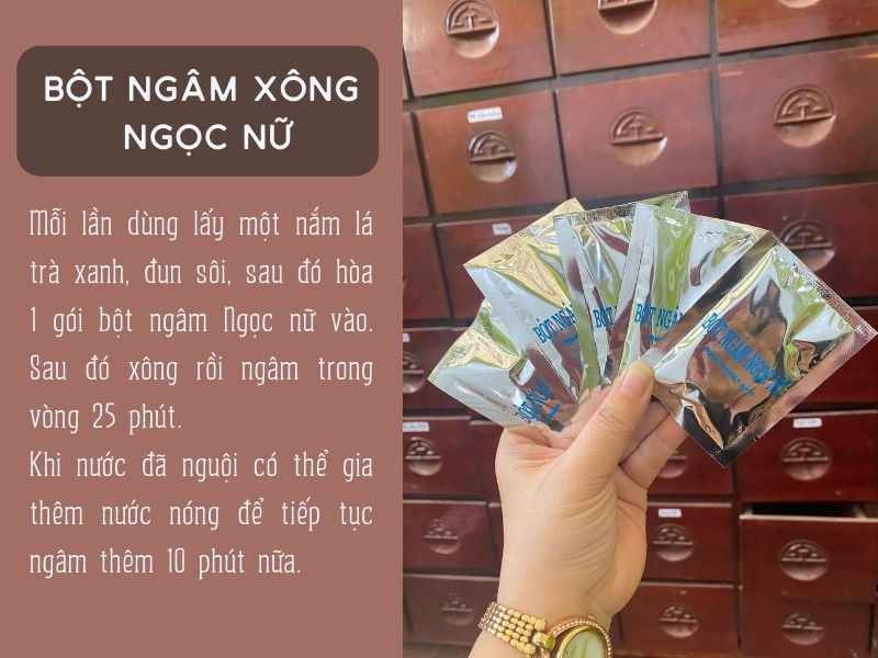 - Thuốc ngâm xông: Mỗi lần dùng lấy một nắm lá trà xanh, đun sôi, sau đó hòa 1 gói bột ngâm Ngọc nữ vào. Sau đó xông rồi ngâm trong vòng 25 phút. Khi nước đã nguội có thể gia thêm nước nóng để tiếp tục ngâm thêm 10 phút nữa.