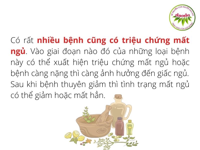 Có rất nhiều bệnh cũng có triệu chứng mất ngủ như bệnh chức năng cơ quan thần kinh, bệnh cao huyết áp, bệnh u nhọt, bệnh xuất huyết não, bệnh lao phổi, vành tim, chức năng tuyến giáp trạng phát triển quá mức bình thường. Vào giai đoạn nào đó của những loại bệnh này có thể xuất hiện triệu chứng mất ngủ hoặc bệnh càng nặng thì càng ảnh hưởng đến giấc ngủ, sau khi bệnh thuyên giảm thì tình trạng mất ngủ có thể giảm hoặc mất hẳn.