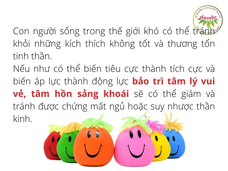 Con người sống trong thế giới khó có thể tránh khỏi những kích thích không tốt và thương tổn tinh thần, nếu như có thể biến tiêu cực thành tích cực và biến áp lực thành động lực bảo trì tâm lý vui vẻ, tâm hồn sảng khoái sẽ có thể giám và tránh được chứng mất ngủ hoặc suy nhược thần kinh.