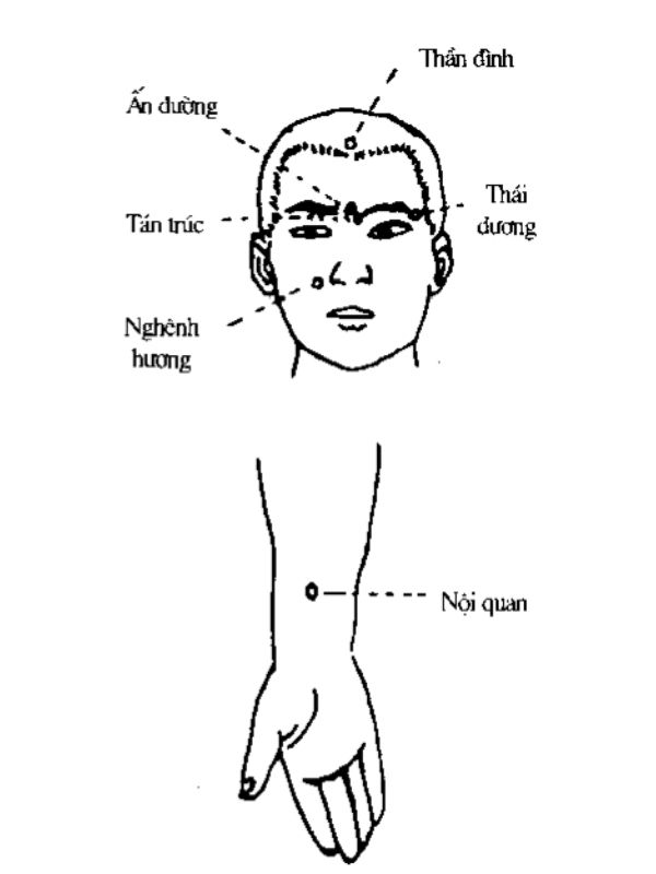 - Dùng ngón cái ấn huyệt Ấn đường 2 phút, sau đó vuốt tới huyệt Thần đình, vuốt đi vuốt lại 6 lần.