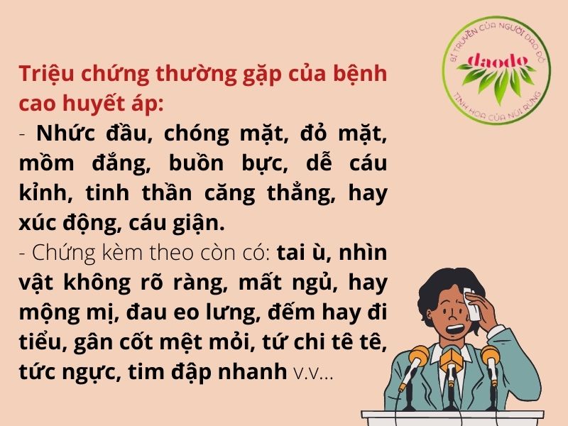 - Biểu hiện lâm sàng của bệnh cao huyết áp có mức độ nặng, nhẹ khác nhau rõ rệt. Có một số người không cảm thấy có bệnh, thường là lúc kiểm tra xét nghiệm mới phát hiện bệnh. Biểu hiện chung là: nhức đầu, chóng mặt, đỏ mặt, mồm đắng, buồn bực, dễ cáu kỉnh, tinh thần căng thẳng, hay xúc động, cáu giận, dễ làm cho huyết áp tăng cao. Chứng kèm theo còn có: tai ù, nhìn vật không rõ ràng, mất ngủ, hay mộng mị, đau eo lưng, đếm hay đi tiểu, gân cốt mệt mỏi, tứ chi tê tê, tức ngực, tim đập nhanh v.v...