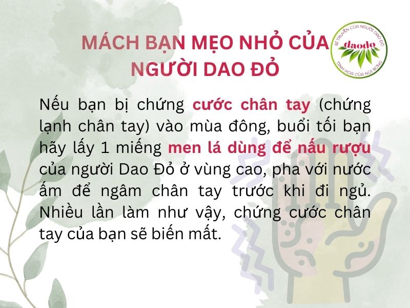 Người Dao Đỏ sống trên vùng núi cao Tây Bắc, nơi có thảm thực vật phong phú và đa dạng. Trong truyền thống của dân tộc Dao Đỏ họ rất giỏi về nghề thuốc, đặc biệt là các bài thuốc tắm, ngâm, xông, đắp,... Với chứng bệnh ra mồ hôi chân tay, họ cũng có một bài thuốc xông ngâm đặc biệt.
