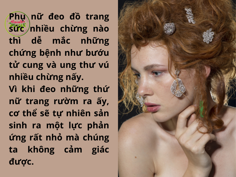 Phụ nữ đeo đồ trang sức nhiều chừng nào thì dễ mắc những chứng bệnh như bướu tử cung và ung thư vú nhiều chừng nấy. Vì khi người phụ nữ đeo những thứ nữ trang rườm ra ấy, cơ thể sẽ tự nhiên sản sinh ra một lực phản ứng rất nhỏ mà chúng ta không cảm giác được. Tuy nhiên lâu ngày chầy tháng cơ thể sẽ ít nhiều bị tác hại bởi ảnh hưởng của những từ trường bất lợi và sẽ tăng tỷ lệ mắc bệnh nhiều hơn.