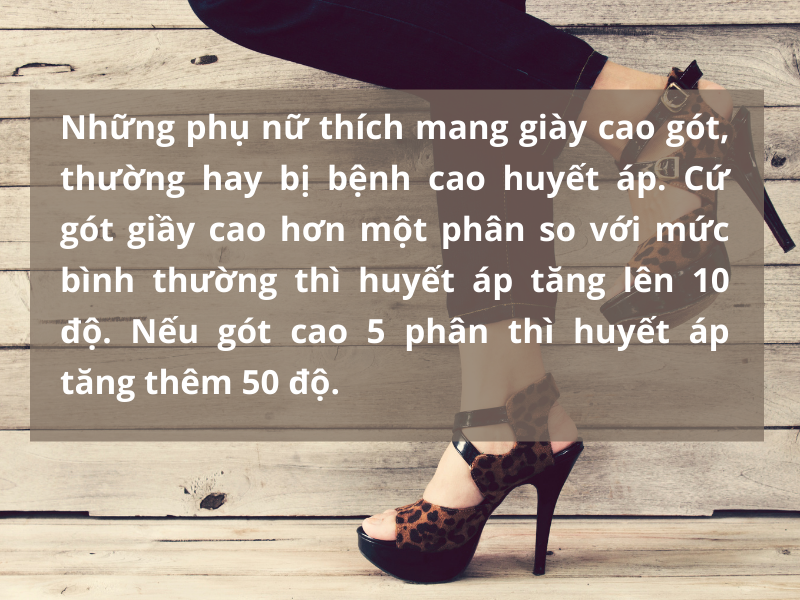 Những phụ nữ thích mang giày cao gót, thường hay bị bệnh cao huyết áp. Cứ gót giầy cao hơn một phân so với mức bình thường thì huyết áp tăng lên 10 độ. Nếu gót cao 5 phân thì huyết áp tăng thêm 50 độ. Do đó trong sinh hoạt hàng ngày, phụ nữ nên mang giầy đế thấp bình thường là an tâm nhất.