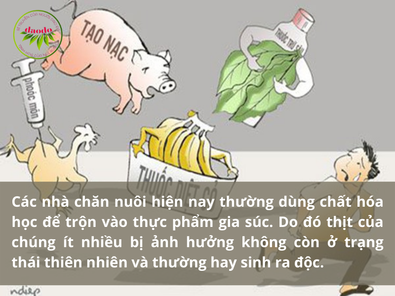 Một thí dụ khác thường thấy xảy ra ở những người thường hay ăn thịt. Chúng ta biết các nhà chăn nuôi hiện nay thường dùng chất hóa học để trộn vào thực phẩm gia súc. Do đó thịt của chúng ít nhiều bị ảnh hưởng và không còn ở trạng thái thiên nhiên và thường hay sinh ra độc.