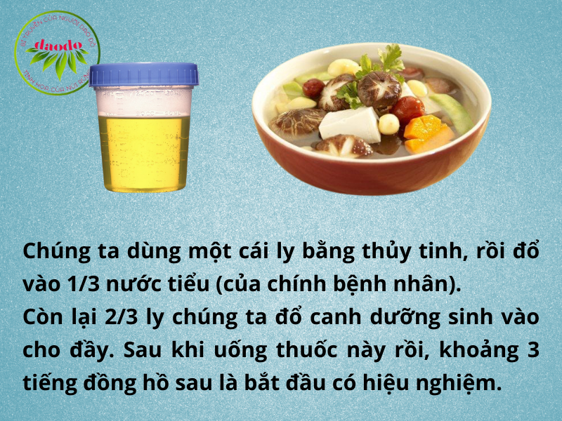 Bây giờ tôi xin nhắc lại phương pháp ấy. Chúng ta dùng một cái ly bằng thủy tinh, rồi đổ vào 1/3 nước tiểu (của chính bệnh nhân). Còn lại 2/3 ly chúng ta đổ canh dưỡng sinh vào cho đầy. Sau khi uống thuốc này rồi, khoảng 3 tiếng đồng hồ sau là bắt đầu có hiệu nghiệm.