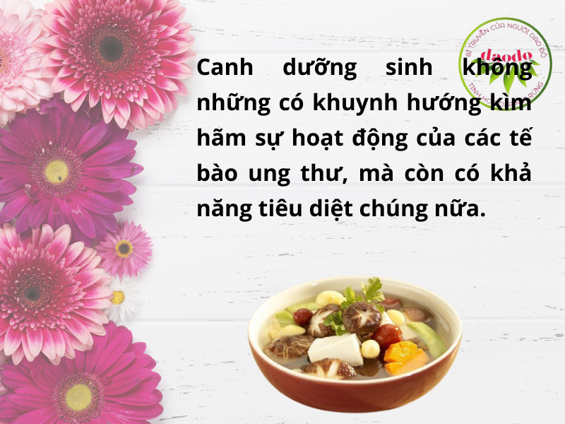 Canh dưỡng sinh không những có khuynh hướng kìm hãm sự hoạt động của các tế bào ung thư, mà còn có khả năng tiêu diệt chúng nữa. Đó là chất liệu thiên nhiên, không qua giai đoạn biến chế nhưng lại có công hiệu thần kì làm cho mọi người kinh ngạc. Phải chăng đó là một ân huệ mà thiên nhiên dành cho nhân loại chúng ta.
