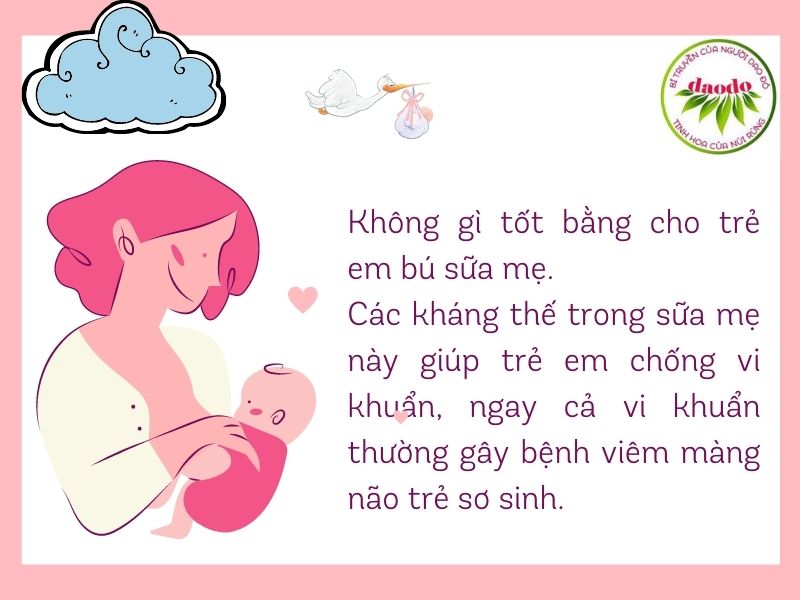 Không gì tốt bằng cho trẻ em bú sữa mẹ. Trước hết thành phần của sữa mẹ rất thích hợp cho đứa trẻ trên mọi khía cạnh. Ngoài ra, theo nữ bác sĩ Pitt (Trường đại học Colombia): trong sữa mẹ có tế bào lympho (có chứa kháng thể) bằng lượng lympho trong máu ngoại vi. Các kháng thế này giúp trẻ em chống vi khuẩn, ngay cả vi khuẩn thường gây bệnh viêm màng não trẻ sơ sinh. Trẻ không nuôi sữa mẹ dễ mắc bệnh nhiều gấp 2 - 3 lần. (theo Med. tr. and med news 1978).