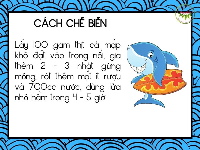 - Cách chữa trị là: lấy 100 gam thịt cá mập khô đặt vào trong nồi, gia thêm 2 - 3 nhát gừng mỏng, rót thêm một ít rượu và 700cc nước, dùng lửa nhỏ hầm trong 4 - 5 giờ là có thể làm được món canh ngon miệng.