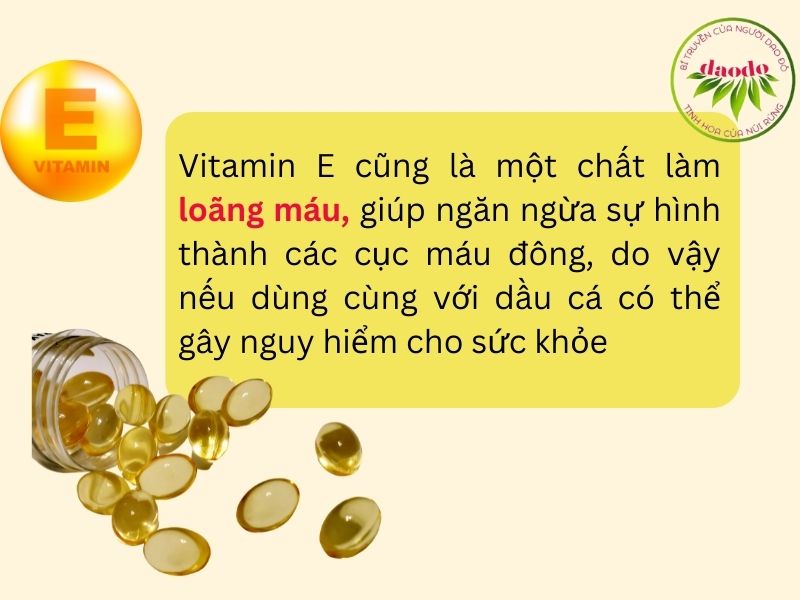 Ngoài ra, vitamin E còn giúp duy trì sự cân bằng vitamin K (được biết là có tác dụng thúc đẩy quá trình đông máu). Do đó, cũng không nên dùng vitamin E cùng với dầu cá. Việc làm loãng máu không chỉ làm dễ bị chảy máu nhiều mà còn dễ bị bầm tím.