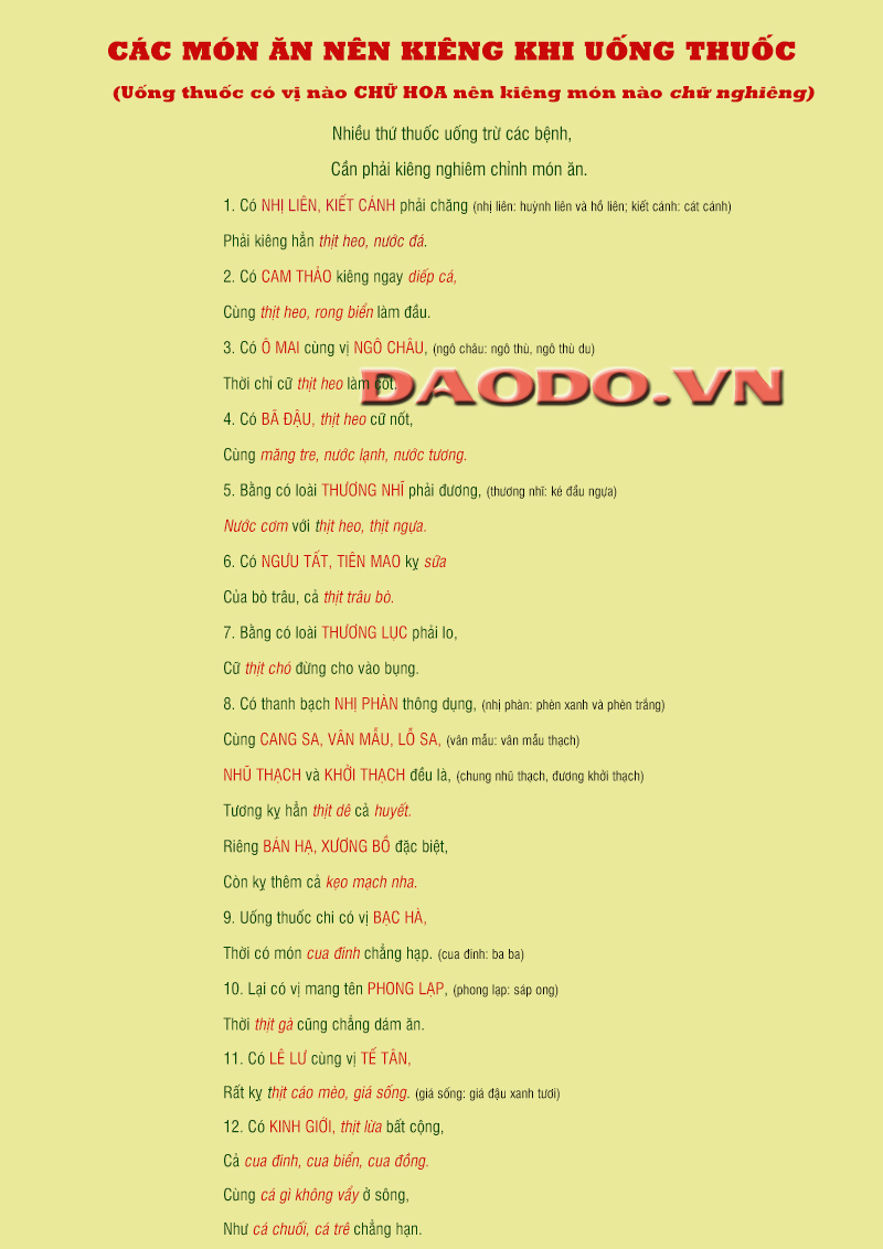 (Uống thuốc có vị nào CHỮ HOA nên kiêng món nào chữ nghiêng)