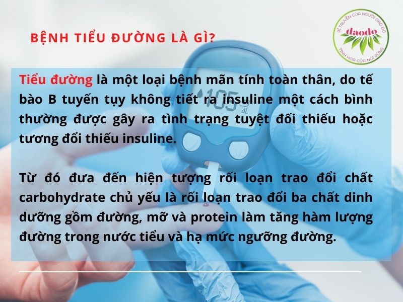 Tiểu đường là một loại bệnh mãn tính toàn thân, do tế bào B tuyến tụy không tiết ra insuline một cách bình thường được gây ra tình trạng tuyệt đối thiếu hoặc tương đổi thiếu insuline, đưa đến hiện tượng rối loạn trao đổi chất carbohydrate chủ yếu là rối loạn trao đổi ba chất dinh dưỡng gồm đường, mỡ và protein làm tăng hàm lượng đường trong nước tiểu và hạ mức ngưỡng đường. Các triệu chứng lâm sàng điển hình là uống nước nhiều, ăn nhiều, đi tiểu nhiều, giảm cân, kèm theo cảm giác người mệt mỏi rã rời.