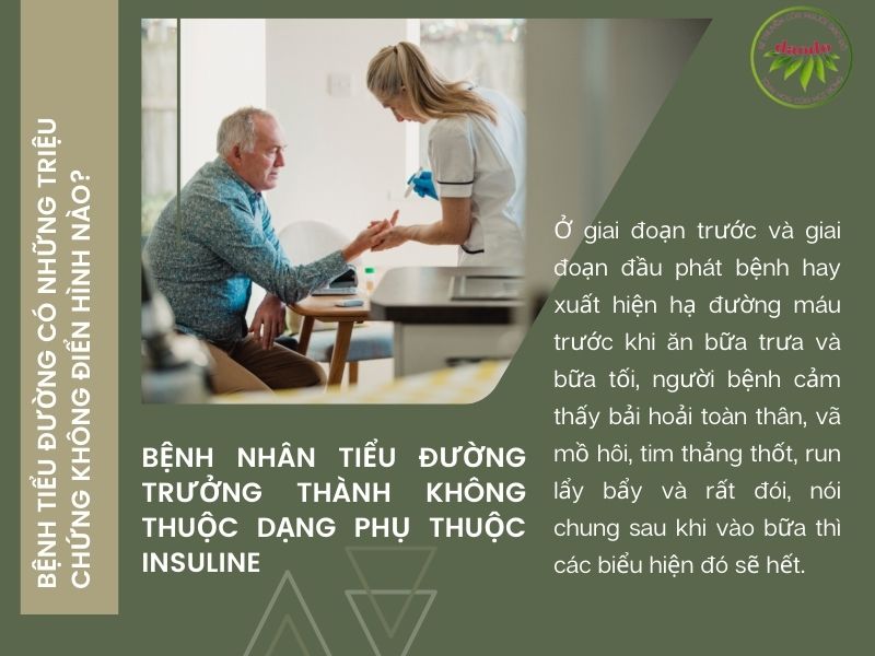 Bệnh nhân tiểu đường trưởng thành không thuộc dạng phụ thuộc insuline, ở giai đoạn trước và giai đoạn đầu phát bệnh hay xuất hiện hạ đường máu trước khi ăn bữa trưa và bữa tối, người bệnh cảm thấy bải hoải toàn thân, vã mồ hôi, tim thảng thốt, run lẩy bẩy và rất đói, nói chung sau khi vào bữa thì các biểu hiện đó sẽ hết.
