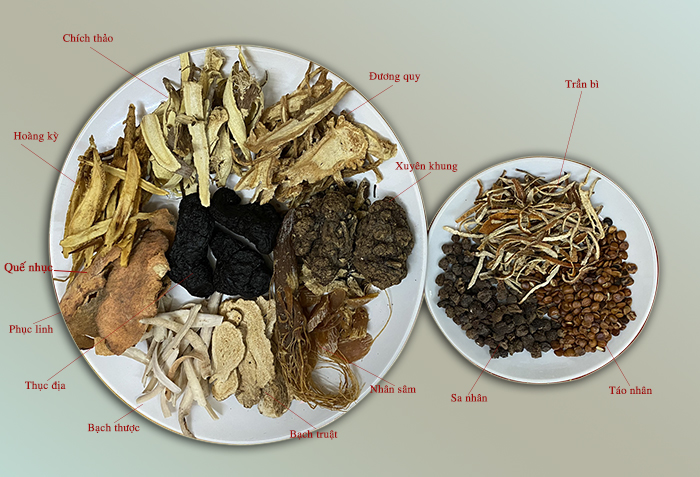 Muốn bổ khí phải bổ phế và tỳ vị, nên trong bài này dùng 4 vị đẳng sâm, chích thảo, phục linh, bạch truật. Các thuốc bổ huyết thường đi theo thuốc bổ khí vì khí huyết luôn luôn đi đôi với nhau: "huyết dẫn khí, khí đẩy huyết". Bài này trị khí huyết hư thiên về dương hư, hư hàn.