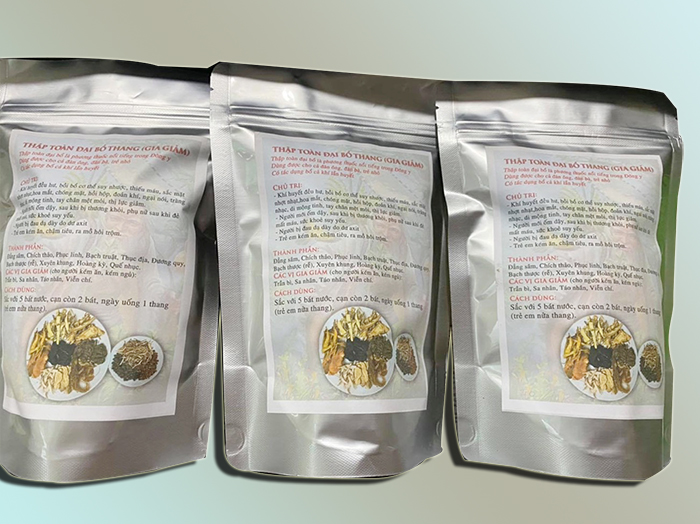 Thang Thập toàn đại bổ Linh Sơn ngoài 10 vị đại bổ chính yếu, còn có đủ các vị gia giảm để quý khách tuỳ nghi sử dụng. Những phương thuốc gia thêm như mộc hương, thần bì, sa nhân sẽ để vào túi riêng đi kèm