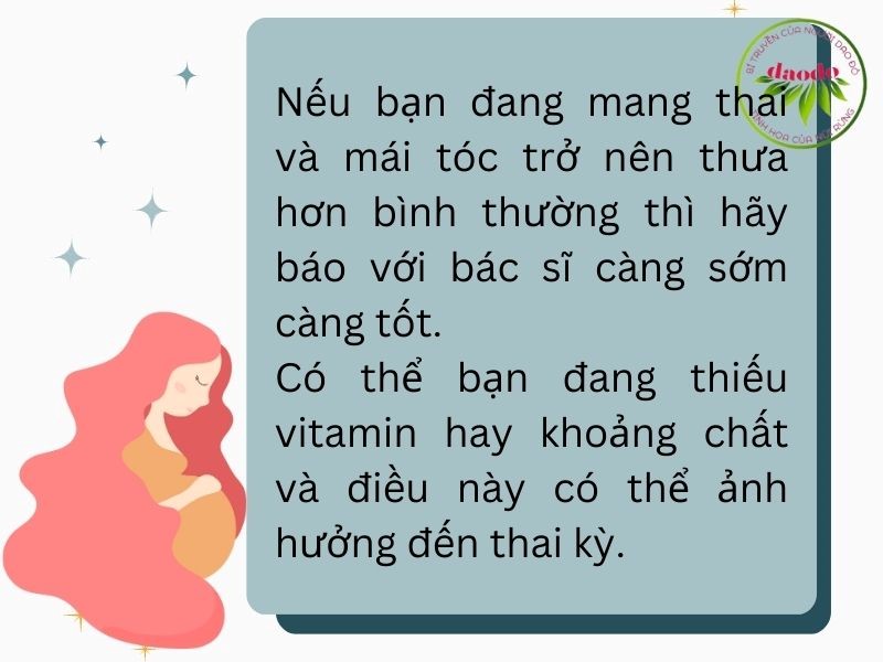 Trong thời gian mang thai, tóc khô có thể trở nên nhờn hoặc bóng hơn còn tóc dầu lại trở nên khô hơn và không còn bóng. Khi mang thai, mái tóc xoăn trước đây có thể trở nên thẳng hơn và ngược lại, tóc thẳng lại xoăn hơn. Tóc thậm chí có thể trở nên dày hơn, tuy nhiên nguyên nhân là do tóc rụng chậm – một hiện tượng bình thường và vẫn hay xảy ra trong thời gian này – chứ không phải do từng sợi tóc trở nên dày hơn (xem phần Rụng tóc ở phụ nữ bên dưới).