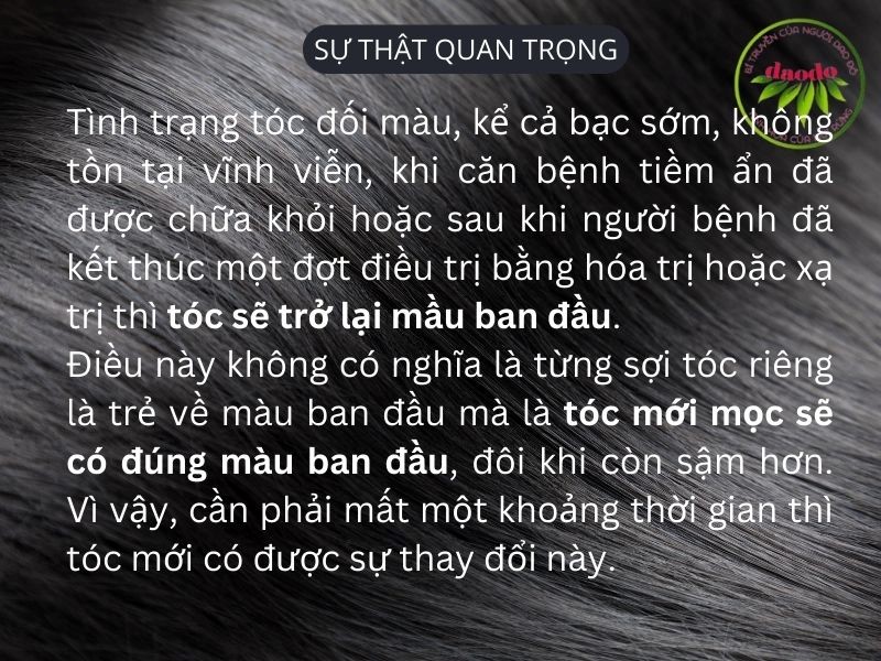 Nhưng khi tóc bạn bạc sớm, đó có thể là tình trạng vô hại do di truyền hoặc là một biểu hiện cảnh báo cơ thể có điều gì đó bất ổn. Tình trạng này (y học gọi là chứng tóc bạc sớm) được các bác sĩ định nghĩa khác nhau. Một số bác sĩ cho rằng đó là chứng bạc hoa râm khi người ta đến tuổi 40, các bác sĩ khác lại cho đó là chứng bạc tóc trước 20 tuổi đối với người da trắng và trước 30 tuổi đối với người da đen.