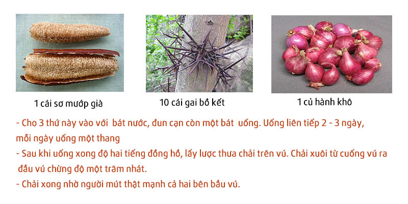 Các thứ đó cho vào với hai bát nước, đun cạn còn một bát gạn trong để lúc gần nguội sẽ uống. Uống liên tiếp từ hai đến ba ngày. Mỗi ngày uống một thang như trên. Sau khi uống xong độ hai tiếng đồng hồ, lấy lược thưa chải trên vú. Chải xuôi từ cuống vú ra đầu vú chừng độ một trăm nhát. Chải xong nhờ người mút thật mạnh cả hai bên bầu vú. Làm như vậy sữa sẽ thông.
