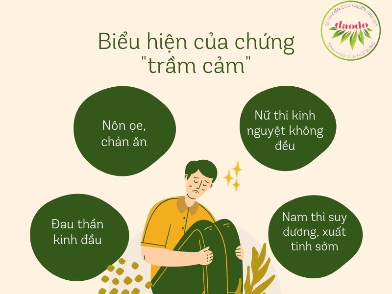 “Trầm cảm” không những làm cho người ta khó chịu về sức khoẻ mà cả tâm lý cũng chịu sức ép lớn, đương nhiên dạng tâm lý này không thể hiện ở một dạng bệnh cụ thể về cơ thể mà do ở tinh thần bị căng thẳng lâu ngày làm cho thần kinh trung ương mất điều hoà, sinh ra hiện tượng “thất thường tinh thần” như đau thần kinh đầu, nôn oẹ, chán ăn, nữ thì kinh nguyệt không đều, nam thì dương suy, xuất tinh sớm v.v...