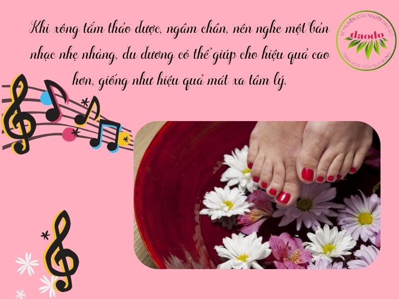 Khi xông tắm thảo dược, ngâm chân, nên nghe một bản nhạc nhẹ nhàng, du dương có thể giúp cho hiệu quả cao hơn, giống như hiệu quả mát xa tâm lý. Việc kết hợp ngâm chân và nghe âm nhạc đã được áp dụng ngay từ cổ đại trở thành truyền thống cho đến ngày nay.