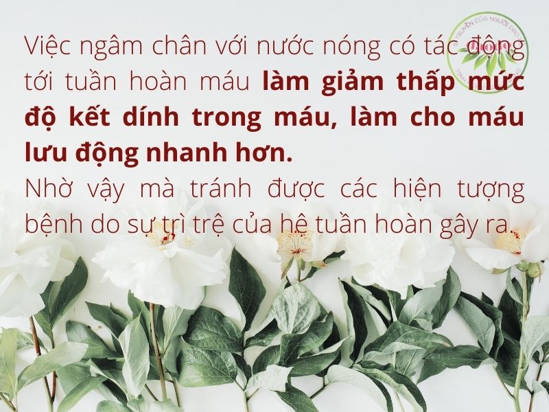Việc ngâm chân với nước nóng có tác động tới tuần hoàn máu làm giảm thấp mức độ kết dính trong máu, làm cho máu lưu động nhanh hơn, nhờ vậy mà tránh được các hiện tượng bệnh do sự trì trệ của hệ tuần hoàn gây ra.
