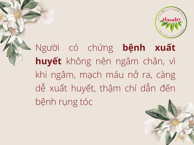 Người có chứng bệnh xuất huyết không nên ngâm chân, vì khi ngâm, mạch máu nở ra, càng dễ xuất huyết, thậm chí dẫn đến bệnh rụng tóc. Nóng nở ra, lạnh co lại là phương thức cơ bản, nên với những chứng xuất huyết, trước tiên nên dùng nước lạnh rửa chân để co mao mạch lại, ngăn chặn xuất huyết chứ không nên dùng nước nóng rửa, ngâm chân. Trường hợp bị thương, nên để sau 24 giờ cho ngưng máu, lúc đó mới nên nghĩ tới ngâm hay không, bằng không, việc ngâm chân có thể dẫn tới hậu quả khó lường.