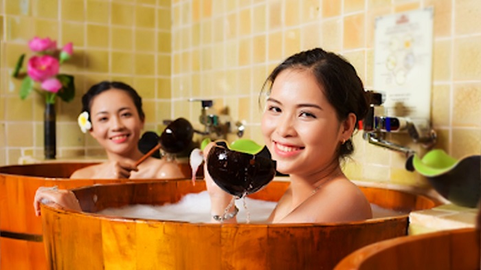 - Khách được ngâm mình lần lượt vào 3 thùng nước khác nhau: