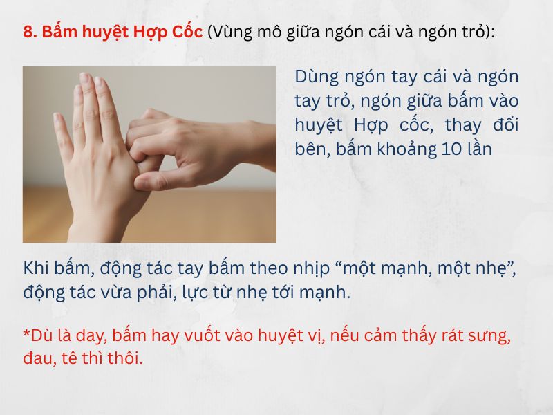 Khép bàn tay lại, tìm điểm cao nhất của khối cơ nối giữa xương bàn tay ngón 1 và ngón 2. Dùng ngón cái tay đối diện bấm mạnh vào, kết hợp day nhẹ. Bấm mỗi bên 10-15 lần, lực mạnh dần. Huyệt Hợp Cốc được mệnh danh là "huyệt tổng đạo" cho các bệnh ở vùng đầu mặt, có công năng tuyên tán phong tà mạnh mẽ, giảm đau đầu, đau họng, nghẹt mũi. Lưu ý không bấm huyệt này cho phụ nữ có thai.