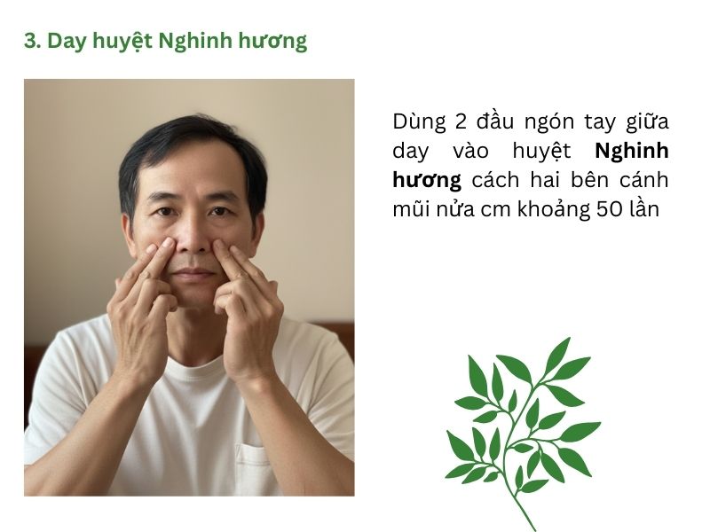 Dùng hai đầu ngón tay giữa day vào huyệt Nghinh hương cách hai bên cánh mũi nửa thốn khoảng 50 lần