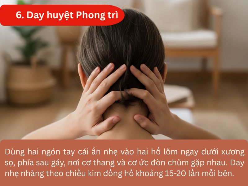 Dùng hai ngón tay cái ấn nhẹ vào hai hố lõm ngay dưới xương sọ, phía sau gáy, nơi cơ thang và cơ ức đòn chũm gặp nhau. Day nhẹ nhàng theo chiều kim đồng hồ khoảng 15-20 lần mỗi bên. Huyệt Phong Trì là cửa ngõ đón phong tà, day huyệt này có tác dụng trừ phong, giải biểu, giảm đau đầu, cứng cổ, sợ lạnh vô cùng hiệu quả.
