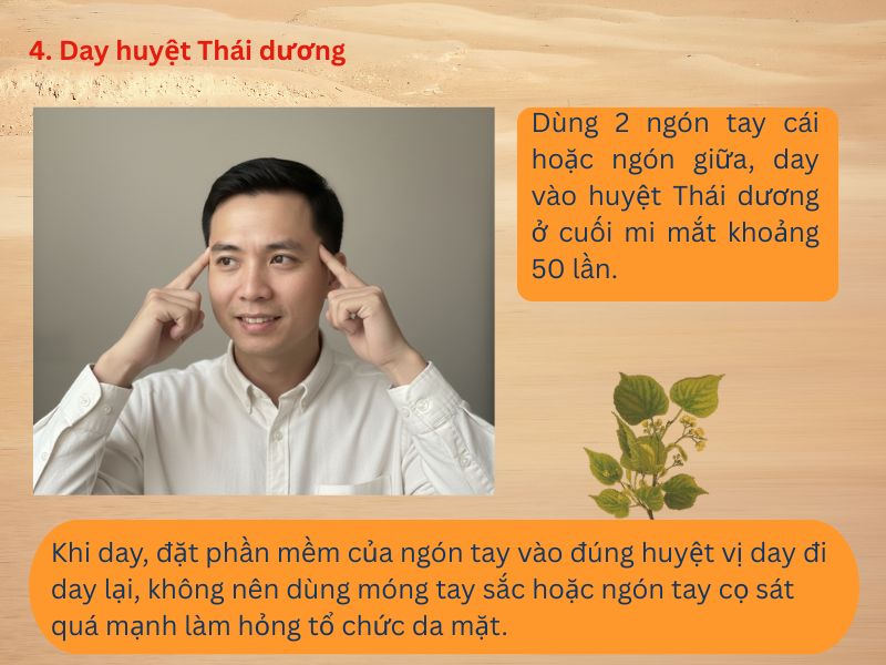 Dùng 2 ngón tay cái hoặc ngón giữa, day vào huyệt Thái dương ở cuối mi mắt khoảng 50 lần. Khi day, đặt phần mềm của ngón tay vào đúng huyệt vị day đi day lại, không nên dùng móng tay sắc hoặc ngón tay cọ sát quá mạnh làm hỏng tổ chức da mặt.