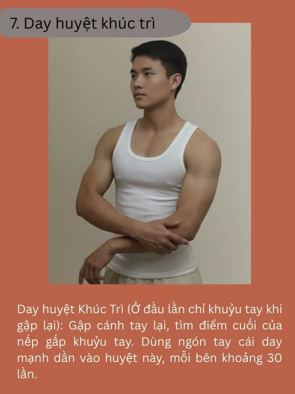 Gập cánh tay lại, tìm điểm cuối của nếp gấp khuỷu tay. Dùng ngón tay cái day mạnh dần vào huyệt này, mỗi bên khoảng 30 lần. Khúc Trì là huyệt hợp thuộc kinh Đại Trường, có tác dụng thanh nhiệt, giải biểu, giảm sốt và tăng cường sức đề kháng toàn thân, đặc biệt hữu hiệu với thể phong nhiệt.