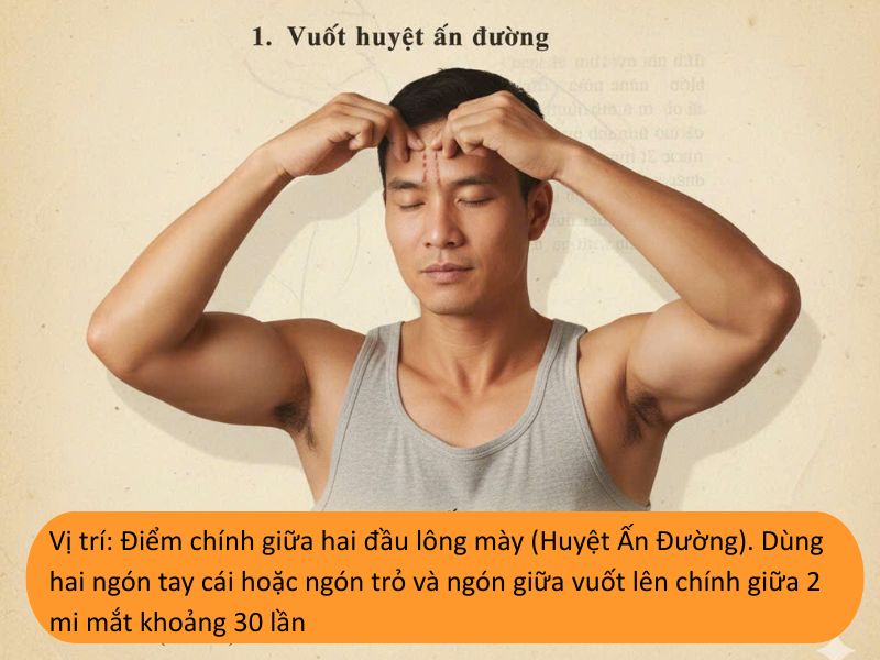 1. Vuốt huyệt Ấn Đường (Giữa hai chân mày): Dùng ngón tay cái hoặc ngón trỏ và giữa của hai tay, đặt nhẹ lên điểm giữa hai đầu chân mày. Vuốt nhẹ nhàng từ dưới lên trên, hướng về đường chân tóc trước, khoảng 30-50 lần. Động tác này giúp khai thông khí ở vùng đầu, giảm đau đầu, nghẹt mũi, tạo cảm giác thư thái.