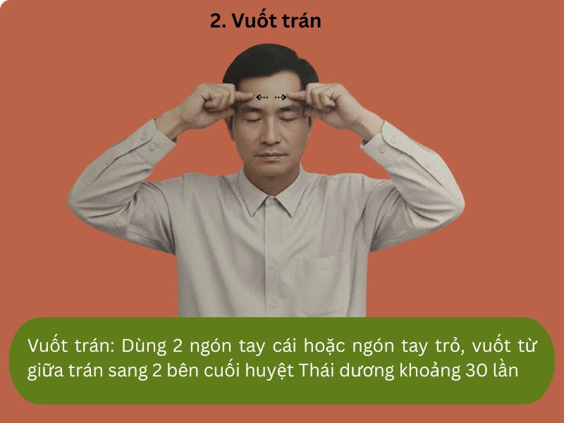 2. Vuốt trán: Dùng 2 ngón tay cái hoặc ngón tay trỏ, vuốt từ giữa trán sang 2 bên cuối huyệt Thái dương khoảng 30 lần