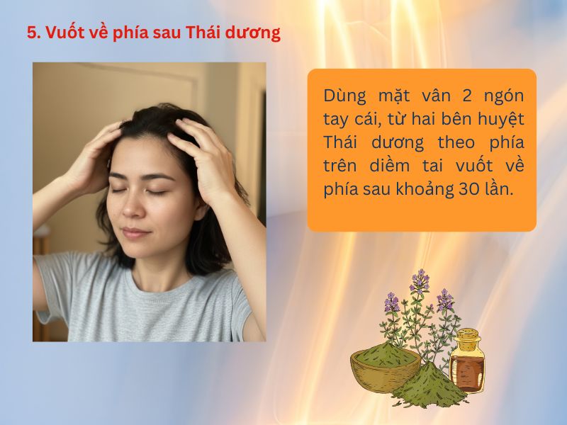 Dùng mặt vân 2 ngón tay cá, từ hai bên huyệt Thái dương theo phía trên diềm tai vuốt về phía sau khoảng 30 lần.