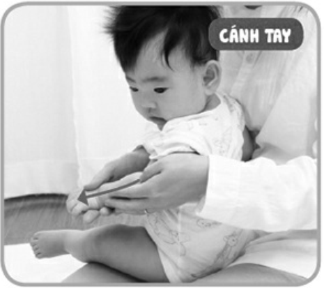 Bạn dùng lòng tay vuốt từ mặt ngoài cùi chỏ đến mu bàn tay bé (động tác vuốt nhẹ bằng lòng bàn tay). Điểm chính yếu ở đây là vuốt ve ở khu vực mặt ngoài bàn tay, là nơi dễ bị cháy nắng nhất trên tay của bé. Động tác này sẽ dễ thực hiện nếu bạn ôm hoặc ẵm bé trong tư thế nằm ngang.