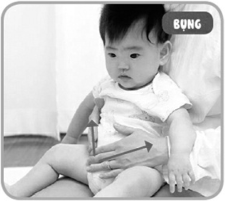 Lấy khu vực bụng ở dưới xương sườn của bé làm trung tâm, dùng toàn bộ lòng bàn tay áp lên bụng bé trong tư thế như thể đầu ngón tay của hai bàn tay sẽ chụm vào nhau. Sau đó nhẹ nhàng kéo hai tay mình ra hai bên bụng bé cùng một lúc (động tác vuốt nhẹ bằng lòng bàn tay). Bạn nên thực hiện động tác này trong tư thế giống như bế bé lúc chụp ảnh.