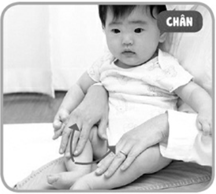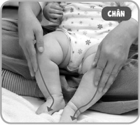Bạn dùng cả lòng bàn tay đặt lên chân bé, vuốt một đường thẳng thật nhẹ nhàng từ cẳng chân lên bắp đùi (động tác vuốt nhẹ bằng cả lòng bàn tay). Điểm xuất phát của động tác này là tại cẳng chân, bạn đặt tay hơi chếch vào phần trong chân của bé. Bạn có thể vừa ôm bé vừa mát xa. Mát xa phần chân của bé giúp khí huyết tại khu vực dễ bị hăm tã lưu thông dễ dàng hơn.