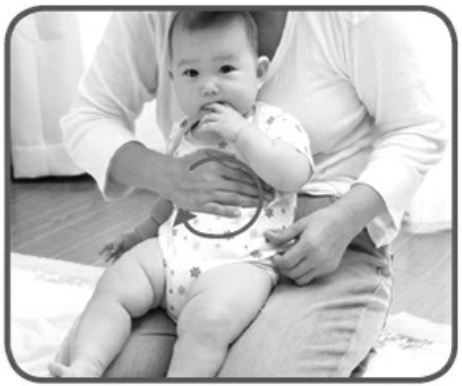 Bạn đặt một tay vào một bên bụng bé rồi tưởng tượng như đang vuốt để dồn thịt hai bên vào khu vực rốn của bé, vuốt từ ngoài vào rốn, từ phía này đến phía kia (động tác vuốt nhẹ bằng lòng bàn tay).