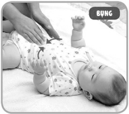 Bạn dùng toàn bộ lòng bàn tay của mình đặt lên khu vực bụng xung quanh rốn và nhẹ nhàng dùng tay xoa tròn theo chiều kim đồng hồ (động tác vuốt nhẹ bằng lòng bàn tay). Bạn thực hiện động tác này khi đang bế bé hoặc cho bé nằm ngửa đều được.