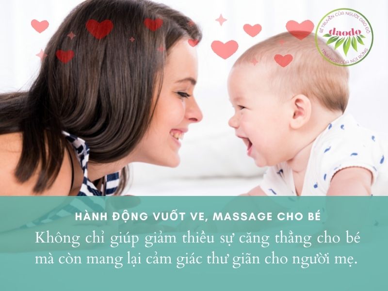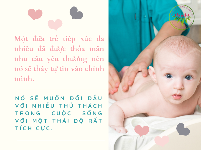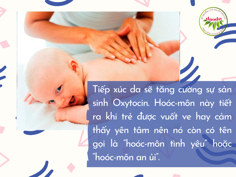 Cho trẻ cảm giác thư giãn. Khi nhận được tín hiệu của việc làn da đang được dịu dàng vuốt ve thì cơ thể sẽ tự động tiết ra hoóc môn Oxytocin. Oxytocin có tác dụng lấy đi cảm giác lo lắng, giảm thiểu cảm giác stress. Khi Oxytocin được giải phóng trong cơ thể thì nhịp tim được điều hòa nên trẻ sẽ cảm thấy tâm trạng cũng như cơ thể mình ở trong trạng thái nhẹ nhõm, dễ chịu. Ngược lại, trong trường hợp trẻ ít được tiếp xúc da thì hoóc-môn Oxytocin cũng ít được tiết ra trong cơ thể nên lúc nào bé cũng cảm thấy căng thẳng. Đây chính là nguyên nhân bất lợi, tác động đến sự ổn định trong tâm trạng cũng như toàn bộ quá trình phát triển của trẻ.