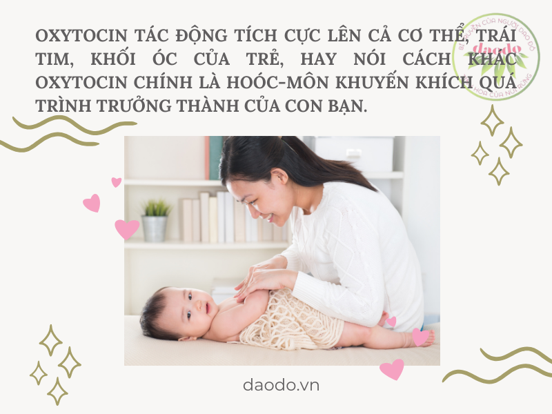 Oxytocin tác động tích cực lên cả cơ thể, trái tim, khối óc của trẻ, hay nói cách khác Oxytocin chính là hoóc-môn khuyến khích quá trình trưởng thành của con bạn. Hỗ trợ quá trình trưởng thành về tình cảm của trẻ. Oxytocin được xem là hoóc-môn có tác động tốt đến tâm lý của trẻ. Cụ thể, đây là hoóc-môn không thể thiếu trong việc kiến tạo mối quan hệ giữa con người và con người, tạo ra sự tin tưởng của trẻ đối với người khác. Xuất hiện đồng thời với cảm giác an tâm khi được mẹ chạm vào da, trẻ cũng sẽ có cảm giác rằng mình có thể tin tưởng được người khác. Nếu trải nghiệm này được lặp đi lặp lại nhiều lần thì tình cảm mến yêu bé dành cho mẹ sẽ ngày một sâu sắc hơn.