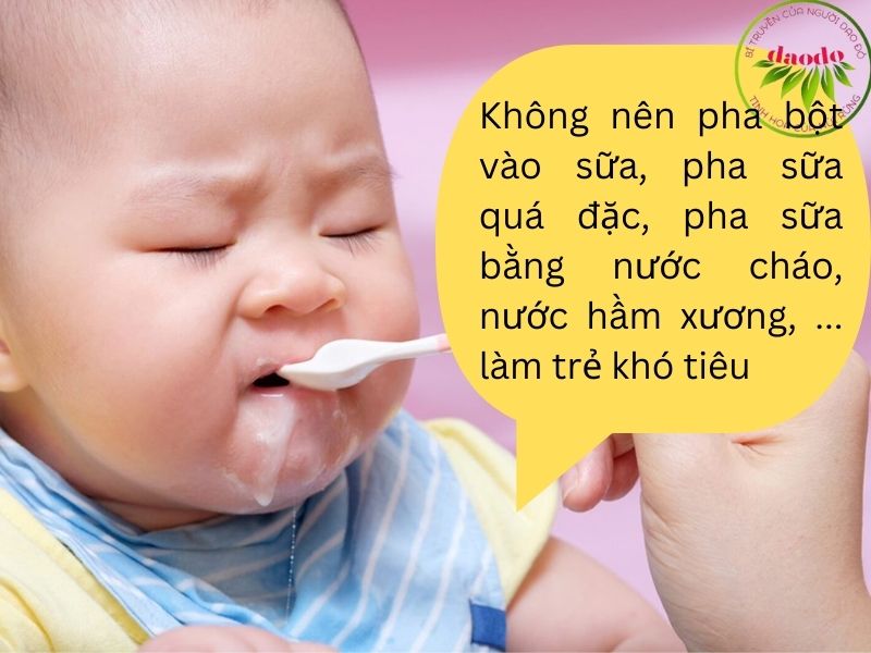 - Không nên pha bột vào sữa, pha sữa quá đặc, pha sữa bằng nước cháo, nước hầm xương, ... làm trẻ khó tiêu.