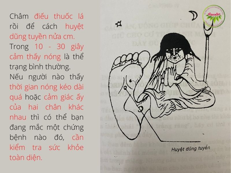 Châm điếu thuốc lá rồi để cách huyệt dũng tuyền nửa cm.