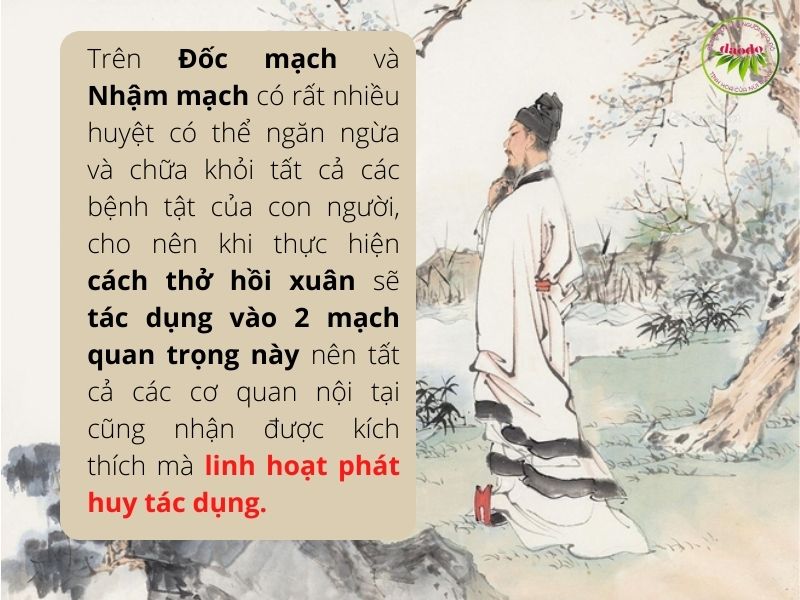 Hai đường kinh lạc này (đường thông lộ có huyệt) khi kích thích vào hậu môn, đồng thời cũng bị kích thích làm cho khí được tuần hoàn tạo ra năng lực cho “cách thở hồi xuân”, do thực hiện “cách thở hồi xuân” ảnh hưởng vào nội thể tạo thành một đường về có thể làm cho dòng điện (khí) đi qua thuận lợi. Cũng tức là nói rằng : không ngừng dùng “cách thở hồi xuân”, kích thích Đốc mạch làm cho kinh lạc này nối liền nhau, khí được tuần hoàn, tạo thân thể khoẻ mạnh.