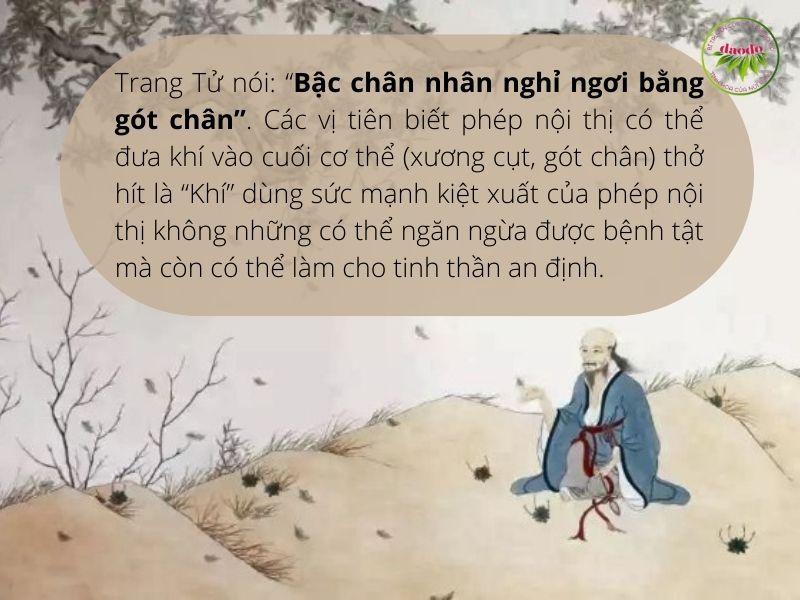 Trang Tử nói: “Bậc chân nhân nghỉ ngơi bằng gót chân”. Chân nhân ở đây là chỉ các vị tiên, các vị tiên biết phép nội thị có thể đưa khí vào cuối cơ thể (xương cụt, gót chân) thở hít là “Khí” dùng sức mạnh kiệt xuất của phép nội không những có thể ngăn ngừa được bệnh tật mà còn có thể làm cho tinh thần an định; tiêu trừ thần kinh chất cuối cùng dẫn đến trường sinh bất lão.