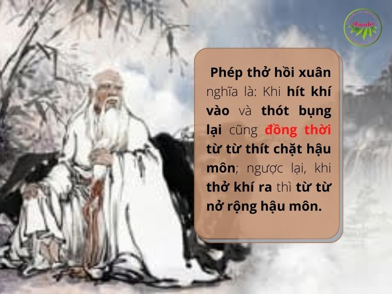 Nay ta đã nhớ cách hít thót thở phình được giới thiệu ở trên, còn cần phải làm một vận động trong khác là phối hợp thở với vận động thít và nở của hậu môn, tức là khi hít khí vào và thót bụng lại cũng đồng thời từ từ thít chặt hậu môn; ngược lại, khi thở khí ra thì từ từ nở rộng hậu môn. Cách thở trên dùng cùng với vận động hậu môn gọi là “cách thở hồi xuân”, liên kết một cách kỳ diệu cách thở với vận động hậu môn, không ngừng tập đi tập lại, nhất định sẽ có kết quả đột xuất.