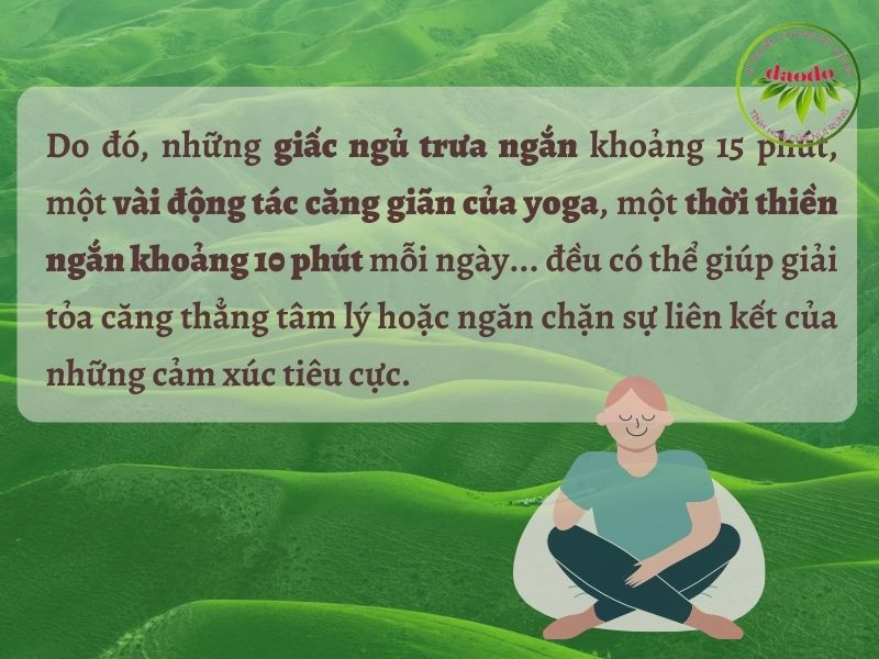 Do đó, những giấc ngủ trưa ngắn khoảng 15 phút, một vài động tác căng giãn tối đa của yoga, một thời thiền ngắn khoảng 10 phút mỗi ngày... đều có thể giúp giải tỏa căng thẳng tâm lý hoặc ngăn chặn sự liên kết của những cảm xúc tiêu cực.